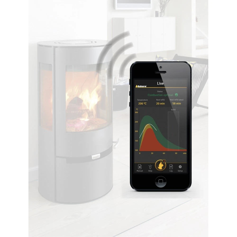 En app til din iPhone/iPad kommunikerer trådløst med sensorer på ovnen og giver dig live data om din Aduro brændeovn. Sensorerne analyserer forbrændingen, giver dig tips til betjeningen og guider dig til at få mest muligt ud af din brændeovn. Appen kan hele tiden vise dig, hvor varm ovnen er, og om den brænder ved for høj eller lav temperatur. Kort sagt kan du holde øje med forbrændingen hvor det passer dig og når det passer dig.